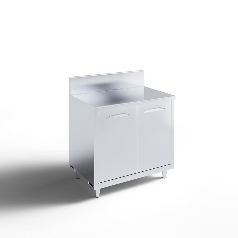 A stainless steel cabinet with two doors, elevated on short legs, featuring a smooth surface and a slight backsplash, set against a plain white background with a shadow on the left side.