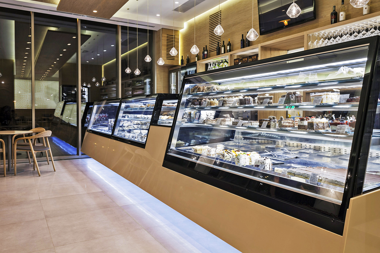 A modern bakery or café interior with glass display cases filled with assorted cakes, pastries, and desserts. The space has warm lighting, wooden accents, and a few tables and chairs for customers.