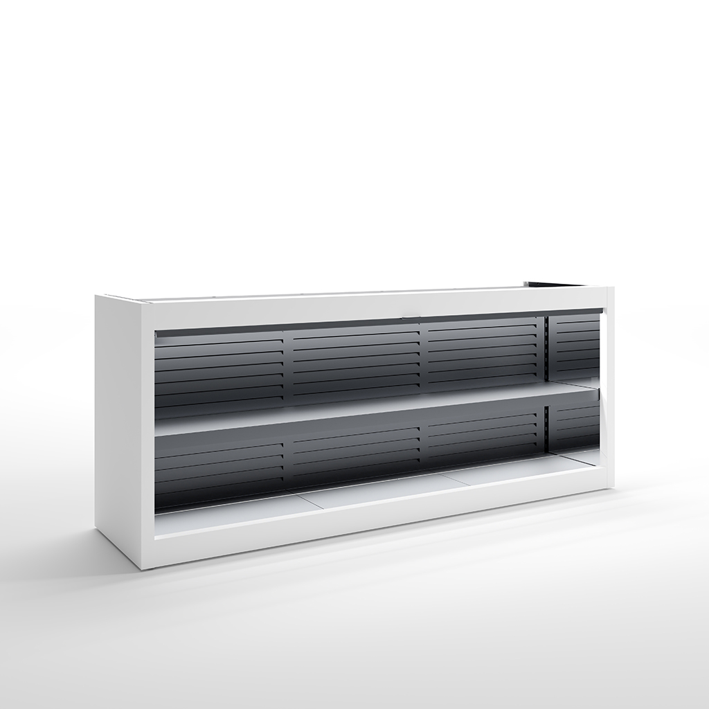 A modern, white retail display shelf with two levels and horizontal slatted black panels on the back; the shelves are empty and set against a plain white background.