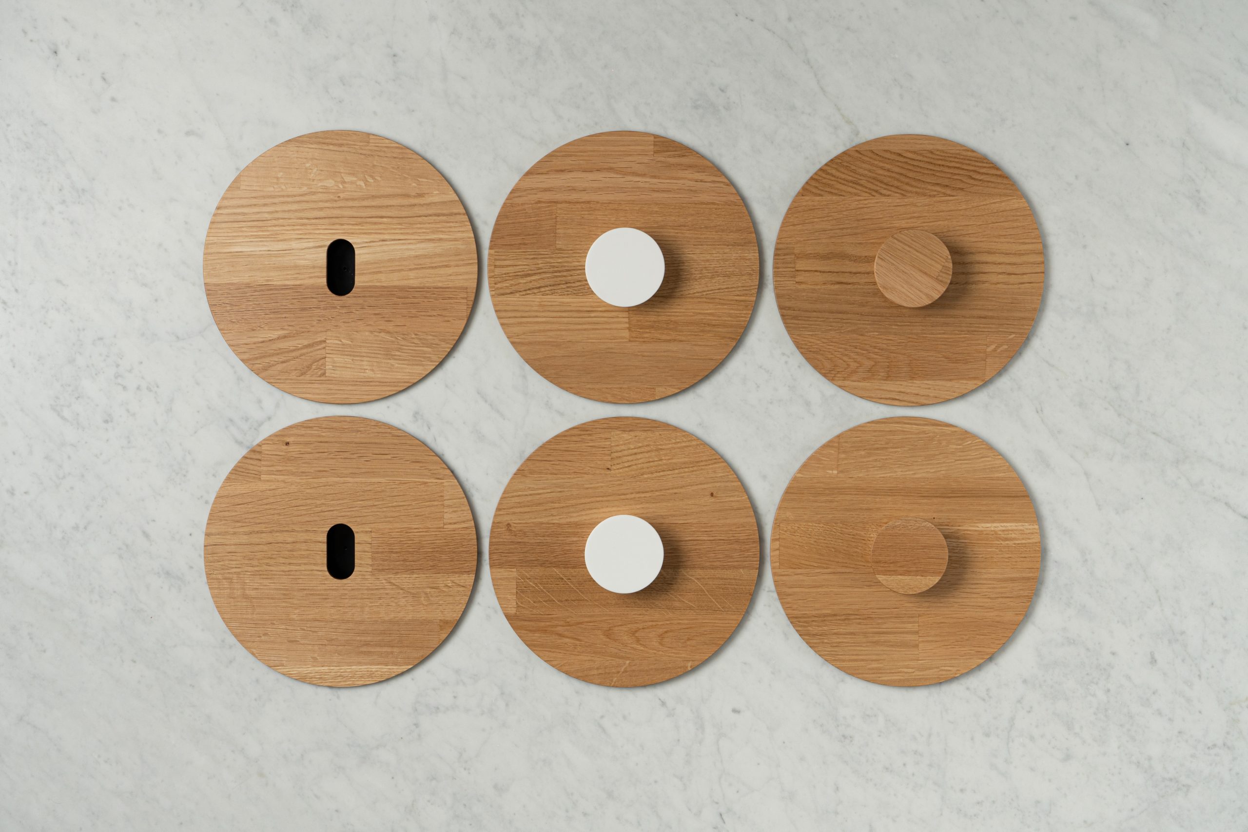 Six round wooden lids are arranged in two rows on a light marble surface. The lids have different handles: two with white knobs, two with wooden knobs, and two with elongated oval cut-outs.