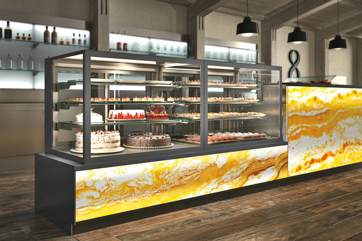 A modern bakery display case filled with assorted cakes, pastries, and desserts stands on a wooden floor. The counter has a bright yellow marble pattern. Shelves and bottles line the back wall.