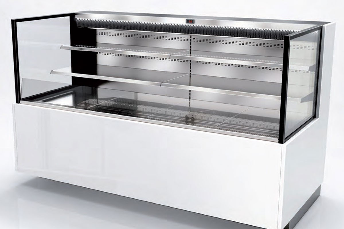 A commercial refrigerated display case with glass front and sides, empty metal shelves, and a white lower base, designed for showcasing food items in a retail or restaurant setting.