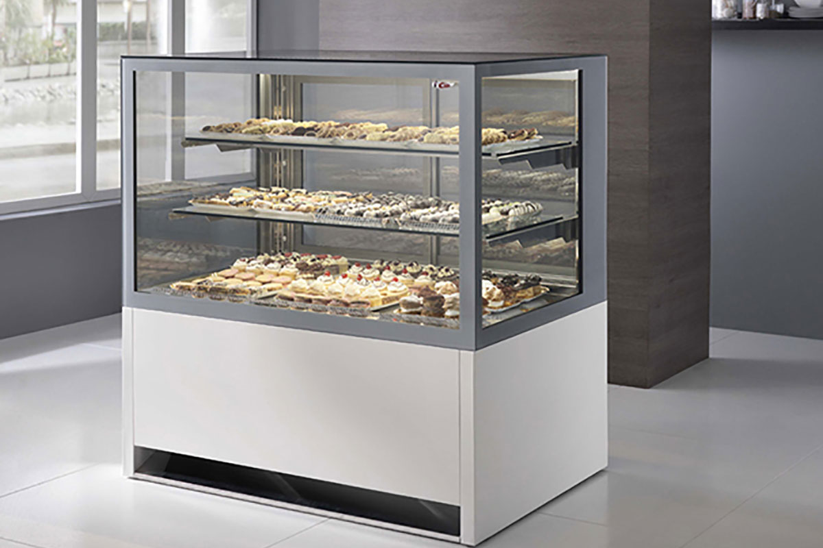 A modern glass display case filled with assorted pastries and desserts on three shelves, situated in a bright, clean bakery or café setting.