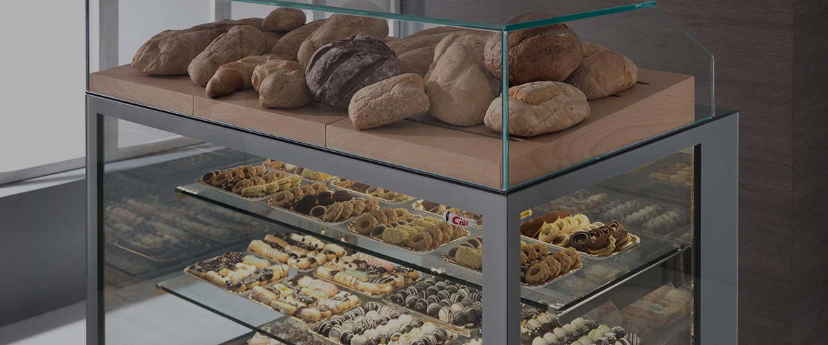 A bakery display case with assorted loaves of bread on the top shelf and trays of various pastries and cookies arranged on lower glass shelves.