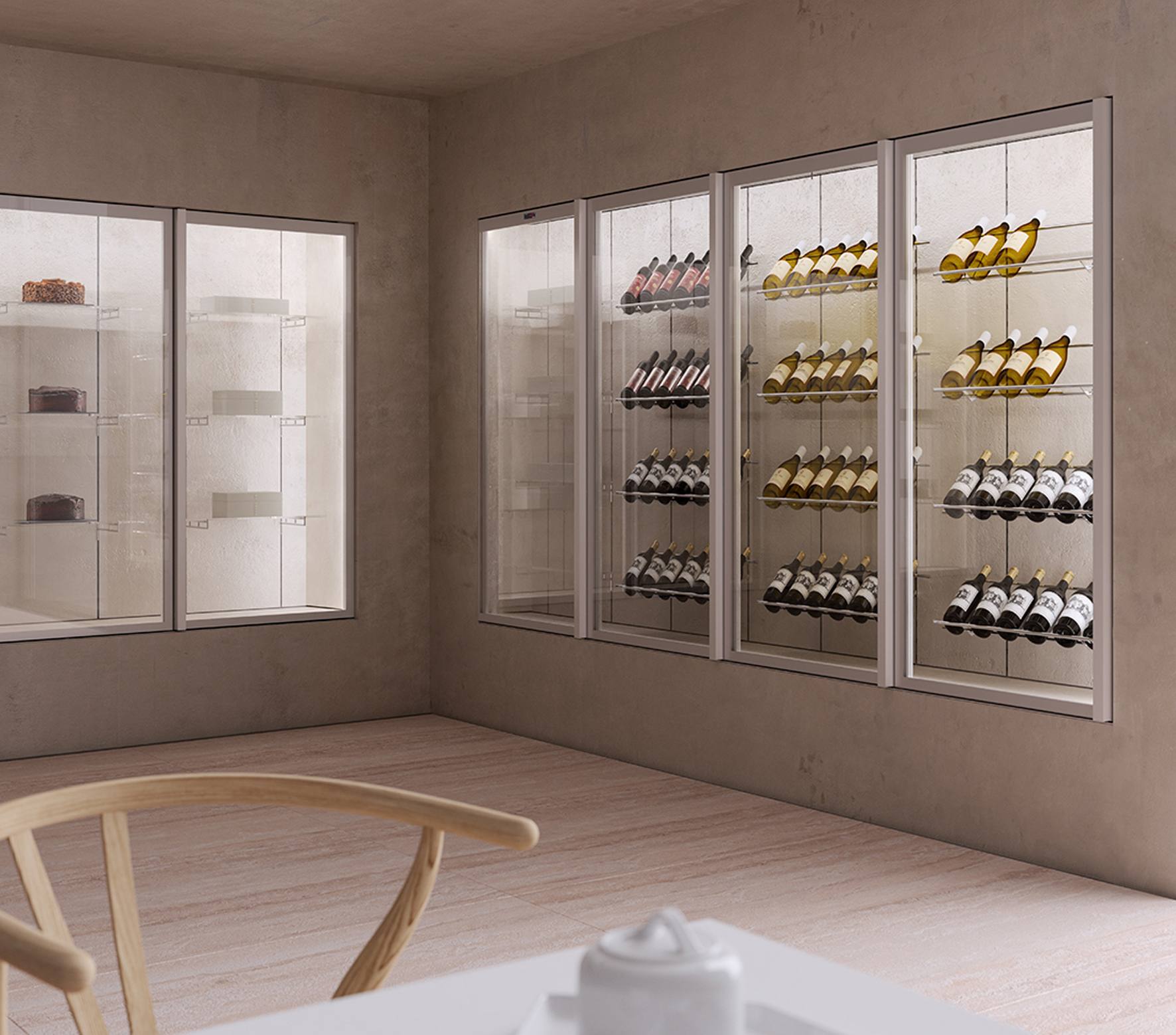 A modern wine display room with glass shelves holding various bottles of wine. There is a wooden chair and a white table with a sugar bowl in the foreground, and pastries on shelves in the background.