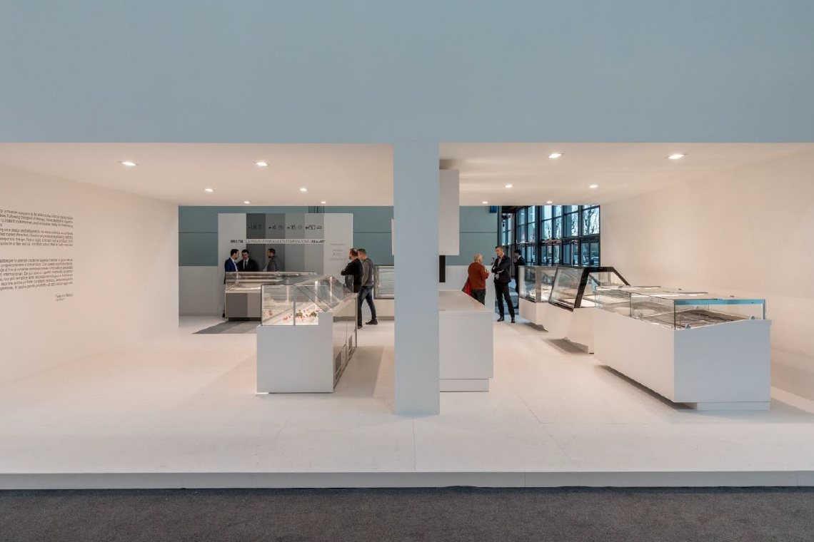 A modern, well-lit museum exhibition space with several glass display cases. People are viewing artifacts inside the cases. Large windows are visible in the background on the right side.