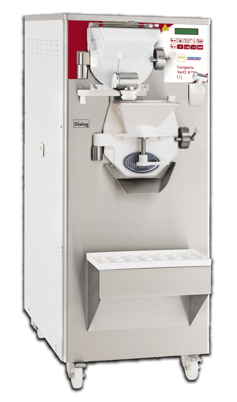 A commercial stainless steel ice cream or gelato machine with a digital control panel, dispensing spout, and a tray for holding containers, standing on wheels for mobility.
